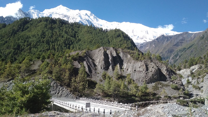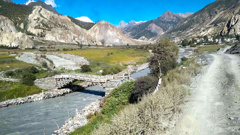 मस्र्याङ्दी नदीको छङछङ आवजसँगै मुस्कुराइ रहेका हिमशृङ्खला र नदी पार गर्न निर्माण गरिएको काठे पुल । मनाङ ङिस्याङ....